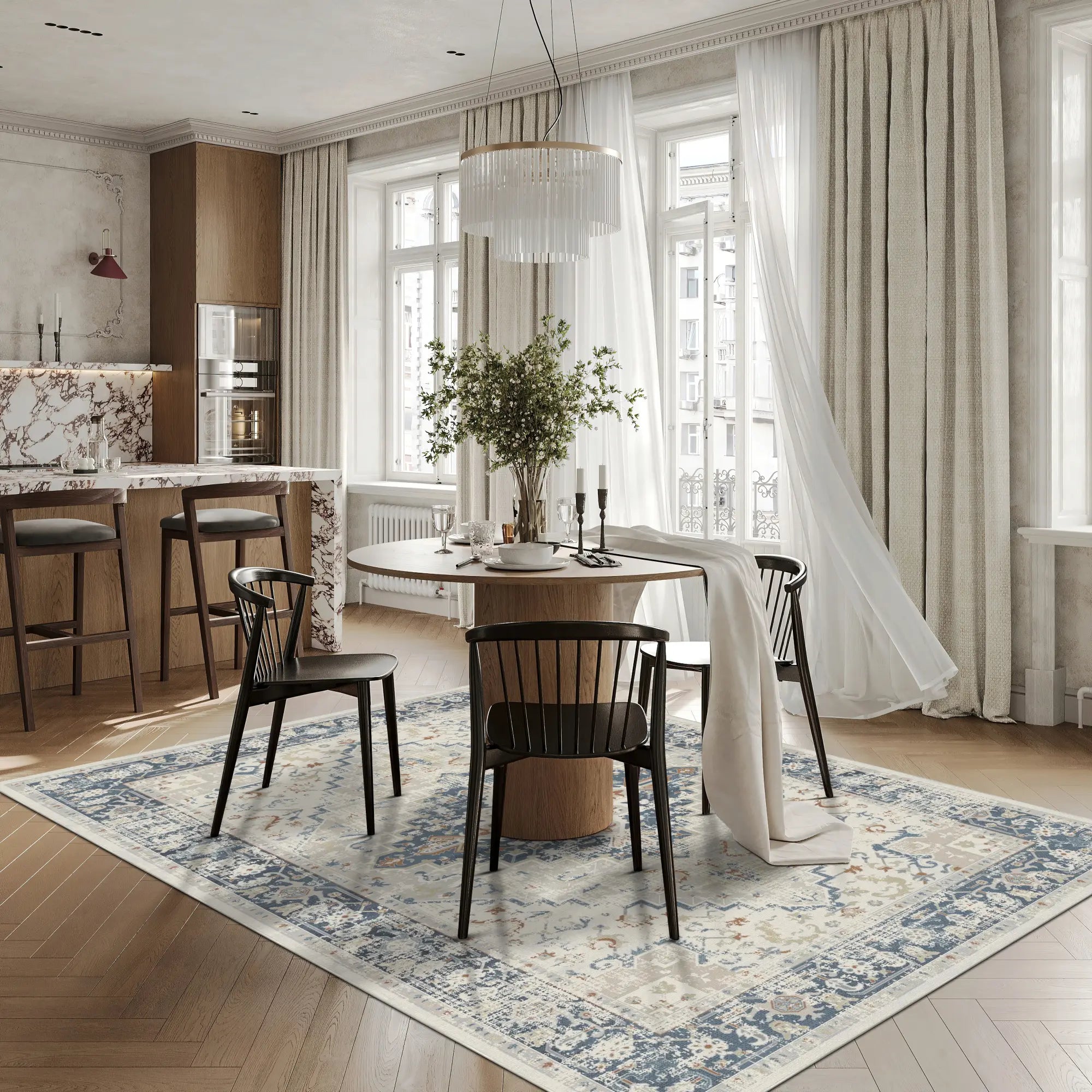 Großzügiger Blickfang: Die helle Grundfarbe lässt Ihren Raum optisch größer wirken, während das strukturierte blaue Medaillon Ihre Möbelanordnung verankert.
