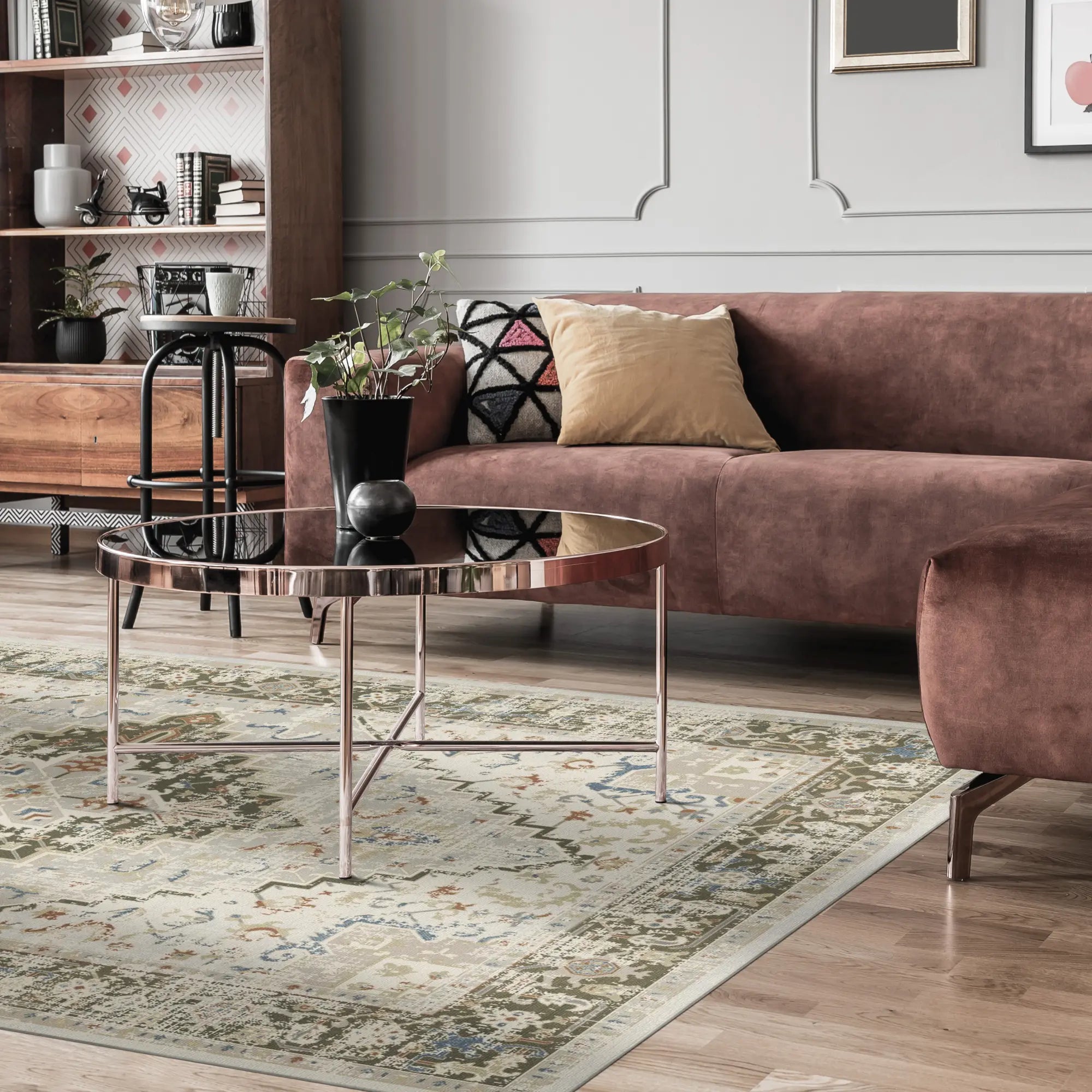 Natürliche Gelassenheit trifft klassische Tradition Der Olive Ivory Heritage Teppich bringt durch eine raffinierte Mischung aus moosigem Grün und hellem Elfenbein eine beruhigende, organische Atmosphäre in Ihren Wohnraum. Im Zentrum steht ein wunderschön detailliertes Medaillon, umrahmt von kunstvollen Bordüren. Das Design wird durch eine bewusst eingesetzte Used-Optik aufgewertet, die ein Gefühl von Geschichte und Zeitlosigkeit vermittelt. Er ist die ideale Grundlage für Räume, die sowohl Helligkeit als auch erdigen Charakter schätzen.