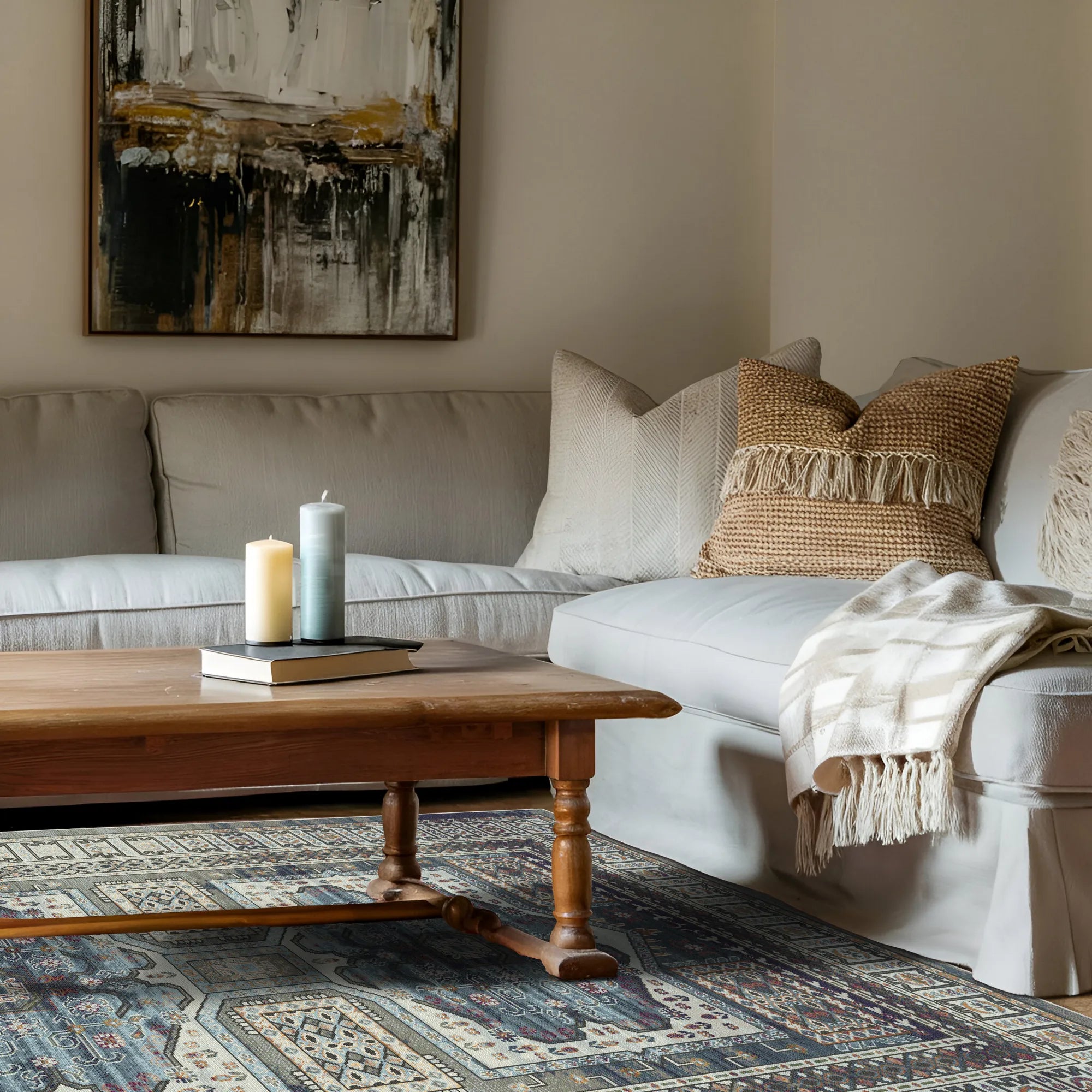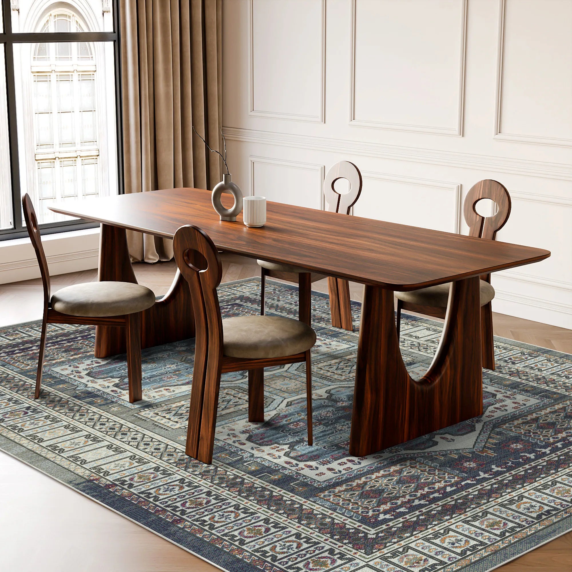 Tauchen Sie ein in eine Welt zeitloser Kunstfertigkeit mit dem Samarkand Night Ethnischer Medaillon Waschbarer Teppich, einem Stück, das die mystische Seele der alten Handelszentren der Seidenstraße einfängt. Das Design ist ein Meisterwerk traditioneller Symmetrie und zeigt ein auffälliges doppelt geschachteltes Medaillon, das als kraftvoller Blickfang dient und das Auge auf sein filigranes botanisches und geometrisches Zentrum lenkt. Ein tiefes Nachthimmel-Saphirfeld bietet eine majestätische Bühne für eine Symphonie aus Terrakotta-, Honiggold- und Schieferblau-Akzenten. Jede Ecke dieses Teppichs erzählt eine Geschichte, mit vielschichtigen architektonischen Rahmen, die das zentrale Motiv wie die kunstvollen Fliesenarbeiten eines großen Karawanserei einrahmen. Ob Sie ein seelenvolles Boho-Wohnzimmer verankern, einem formellen Essbereich eine Prise Prestige verleihen oder einem modernen Arbeitszimmer einen Hauch globaler Geschichte hinzufügen möchten – dieser Teppich bietet eine unvergleichliche Mischung aus kultureller Tiefe und anspruchsvoller Ästhetik.