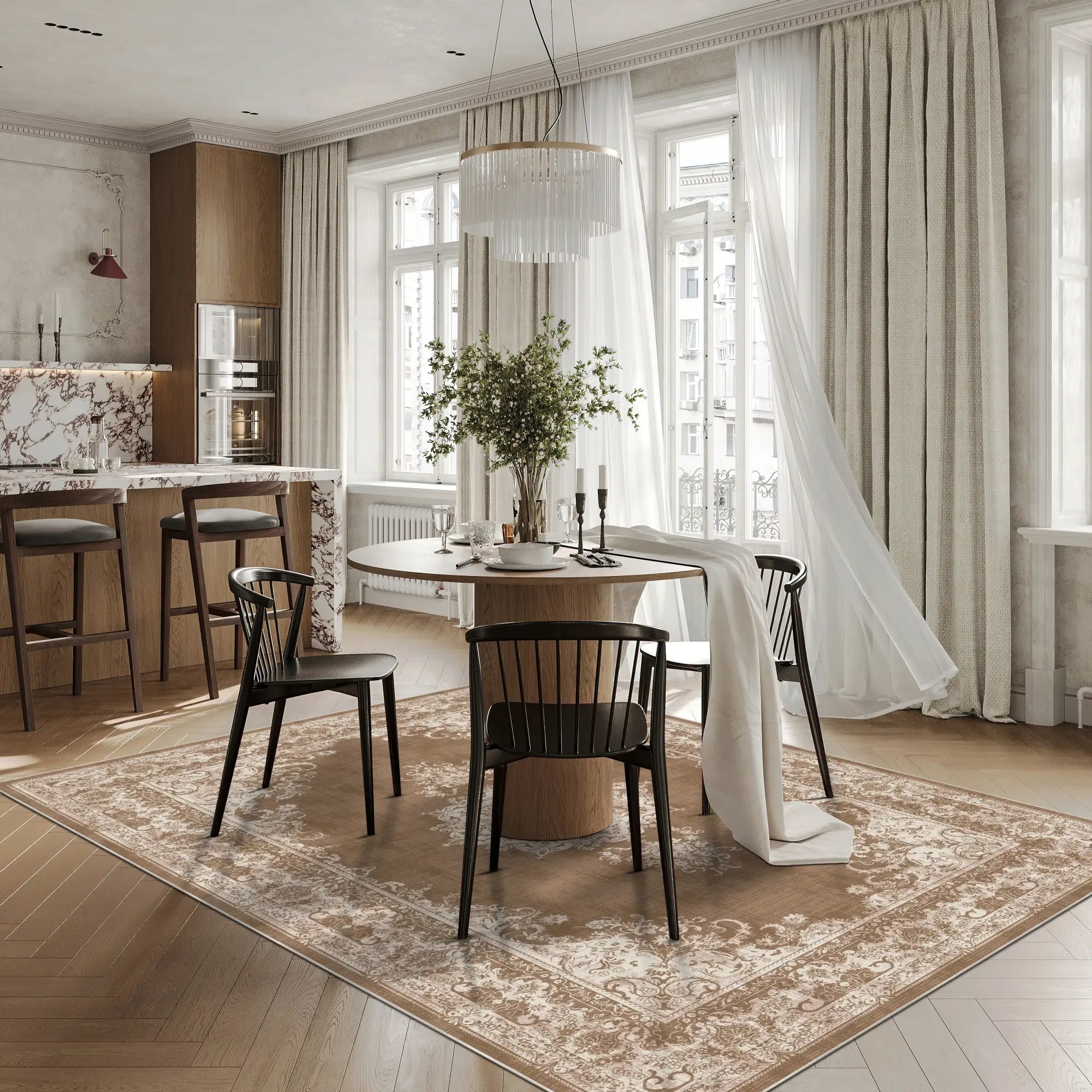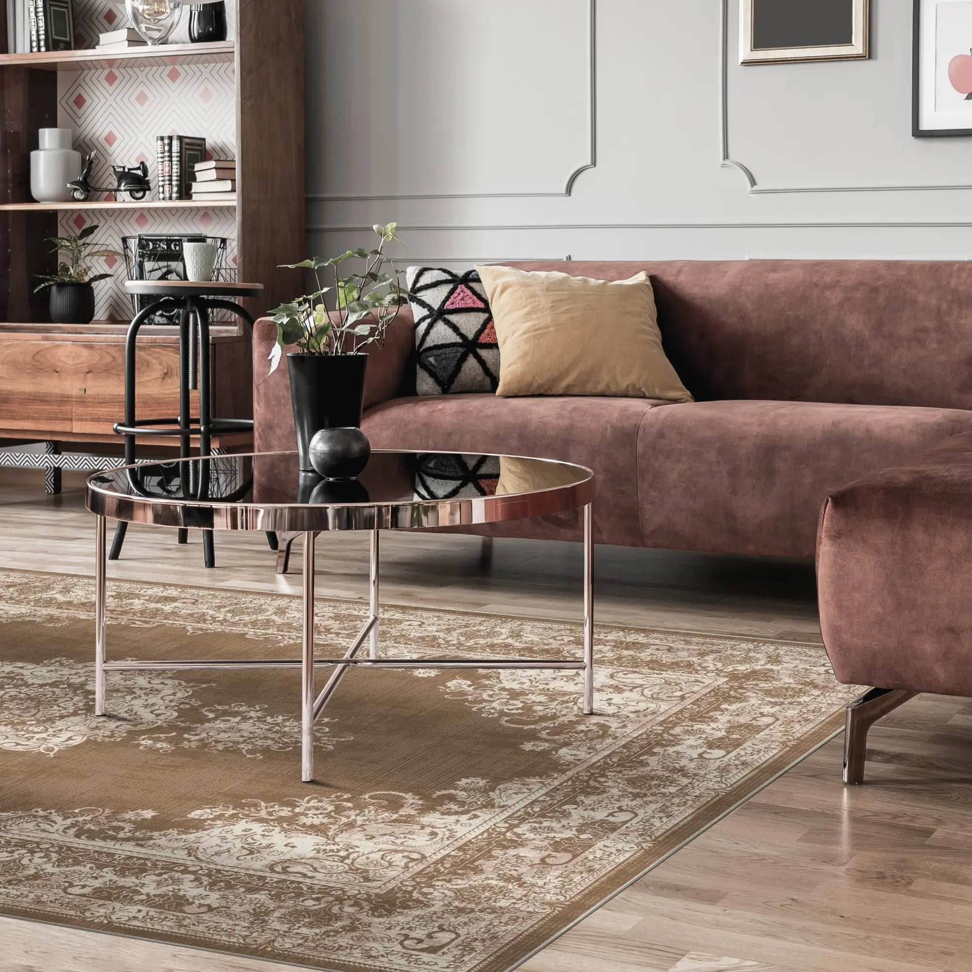 Erdige Raffinesse mit antikem Charakter Dieser digital bedruckte Teppich bringt eine warme, erdende Farbpalette in ein hochdetailliertes botanisches Design. Mit einem großen zentralen Blumenmedaillon und zarten, rankenartigen Eckmotiven fängt er perfekt die Balance zwischen traditioneller Eleganz und modernem Wohndesign ein. Die raffinierte, abgenutzte Optik verleiht einen authentischen, verwitterten Look und sorgt sofort für Wärme und historische Tiefe in jedem Raum.