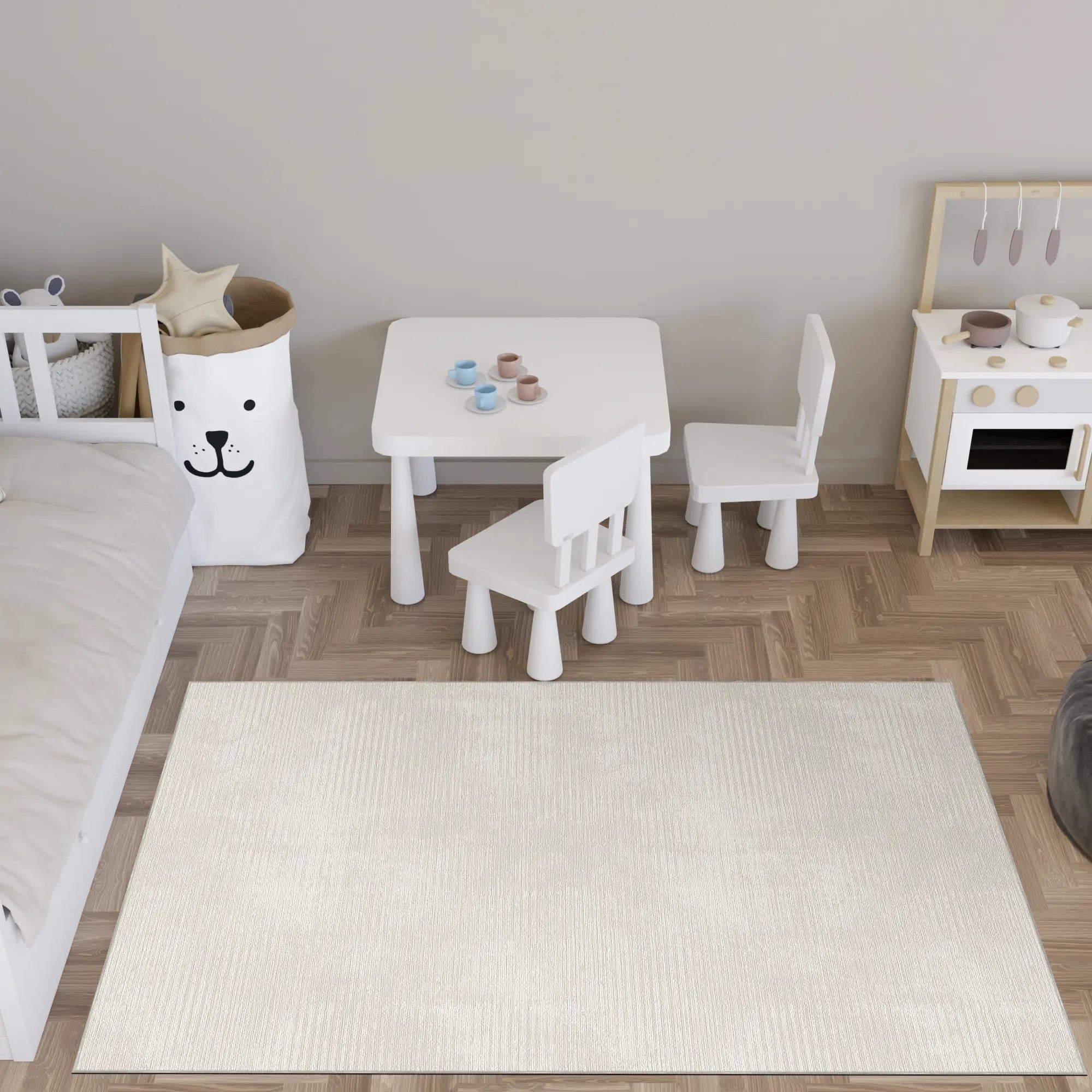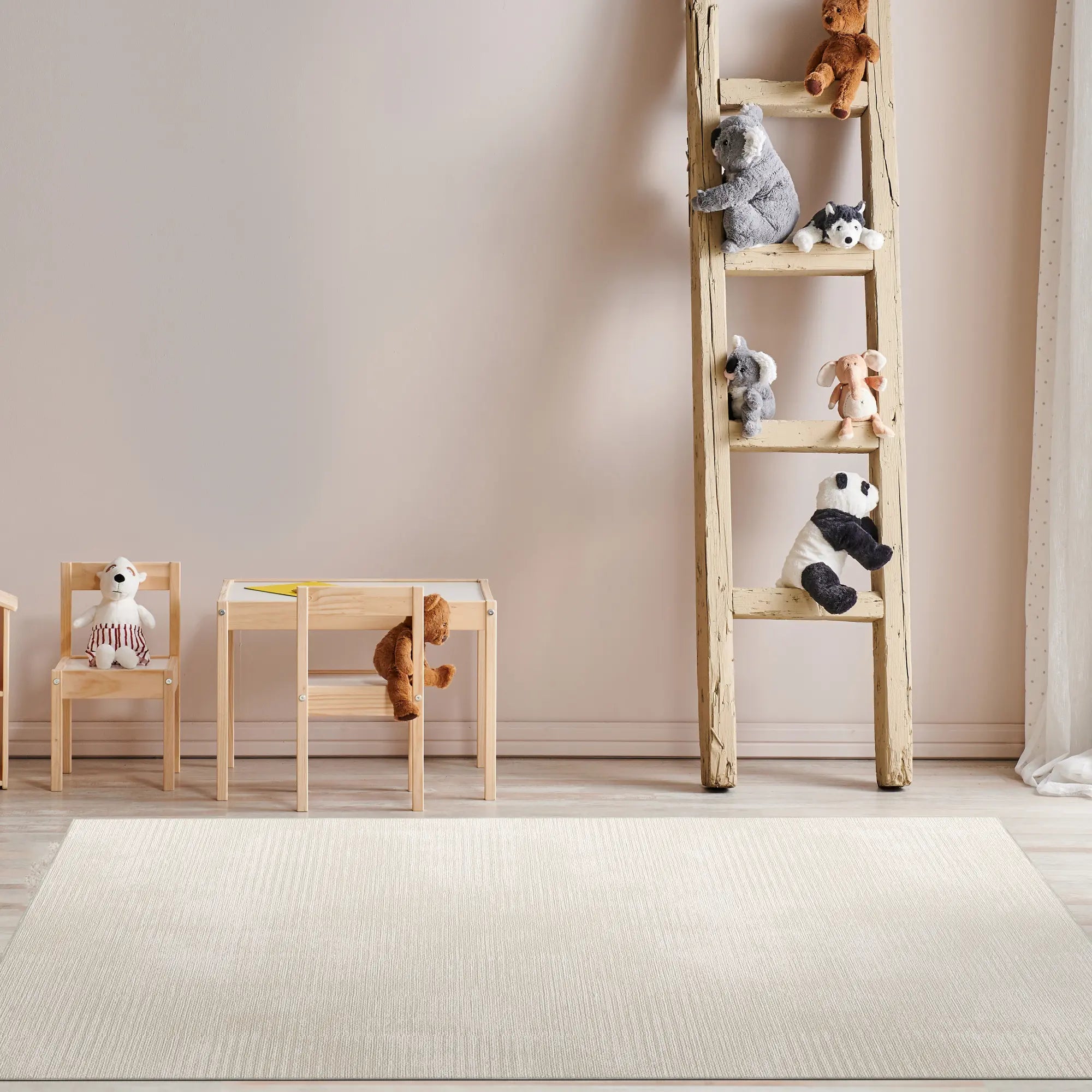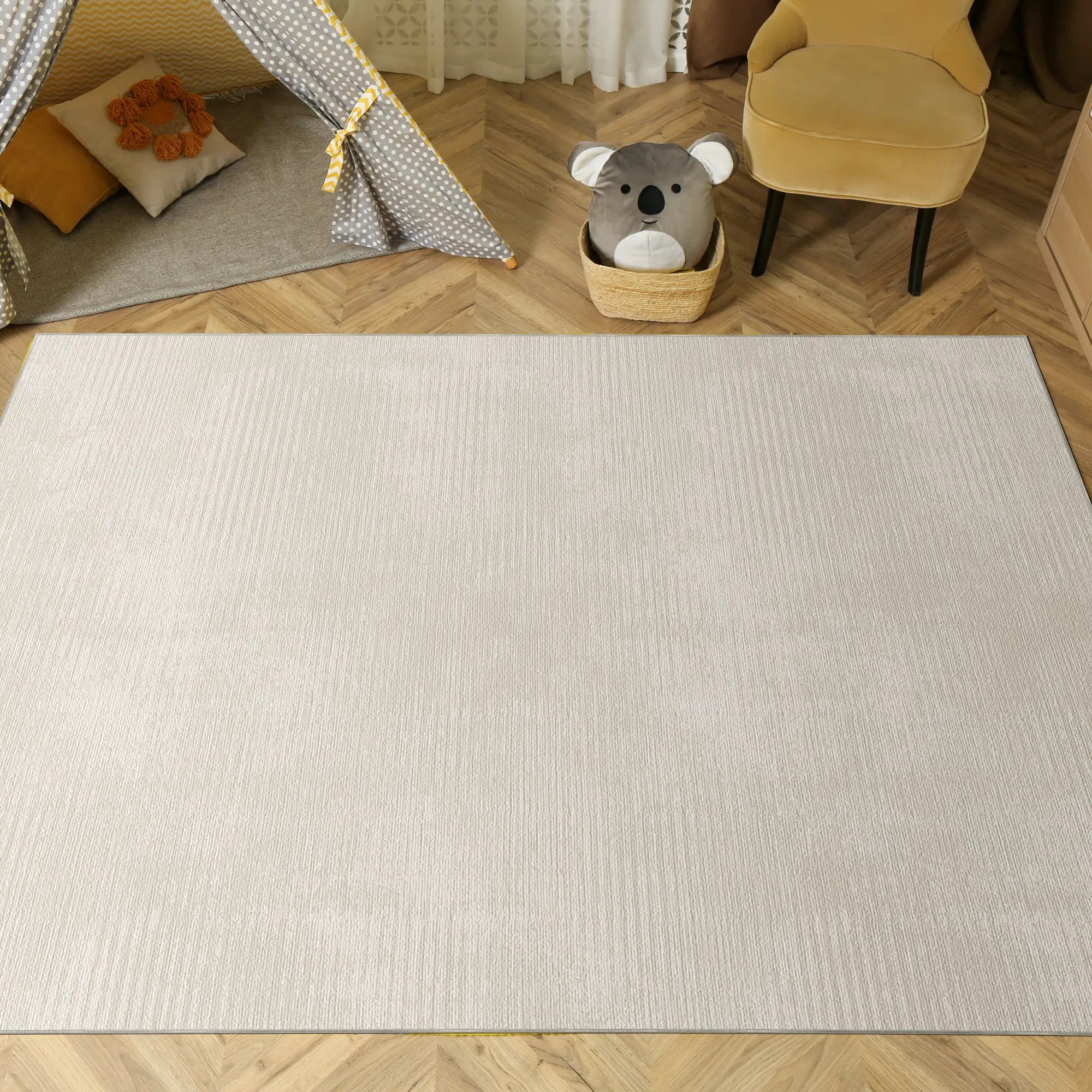 Schaffen Sie eine helle und anspruchsvolle Grundlage für Ihr Zuhause mit unserem waschbaren strukturierten Teppich in Creme. Diese elegante Bodenbedeckung verfügt über eine schöne cremefarbene Basis, die durch eine dezente melierte Textur mit feinen horizontalen Streifen veredelt wird. Das vielseitige und minimalistische einfarbige Design macht ihn zur perfekten Wahl für ein ruhiges Kinderzimmer, ein modernes Wohnzimmer oder ein zeitgemäßes Schlafzimmer. Wir wissen, dass die Pflege eines makellosen Zuhauses oberste Priorität hat – genau deshalb ist dieser hochwertige Teppich vollständig maschinenwaschbar. Sie können Ihre Böden mühelos makellos und hygienisch sauber halten, ohne den Aufwand teurer professioneller Reinigung. Wenn sich im Alltag Flecken, Schmutz oder Staub ansammeln, legen Sie den Teppich einfach in die Waschmaschine für eine schnelle und unkomplizierte Auffrischung. Die strapazierfähige, weiche und flachflorige Verarbeitung bietet eine angenehme Oberfläche zum Barfußlaufen und täglichen Spielen, sodass dieses elegante Stück für jeden lebhaften Haushalt äußerst praktisch ist.